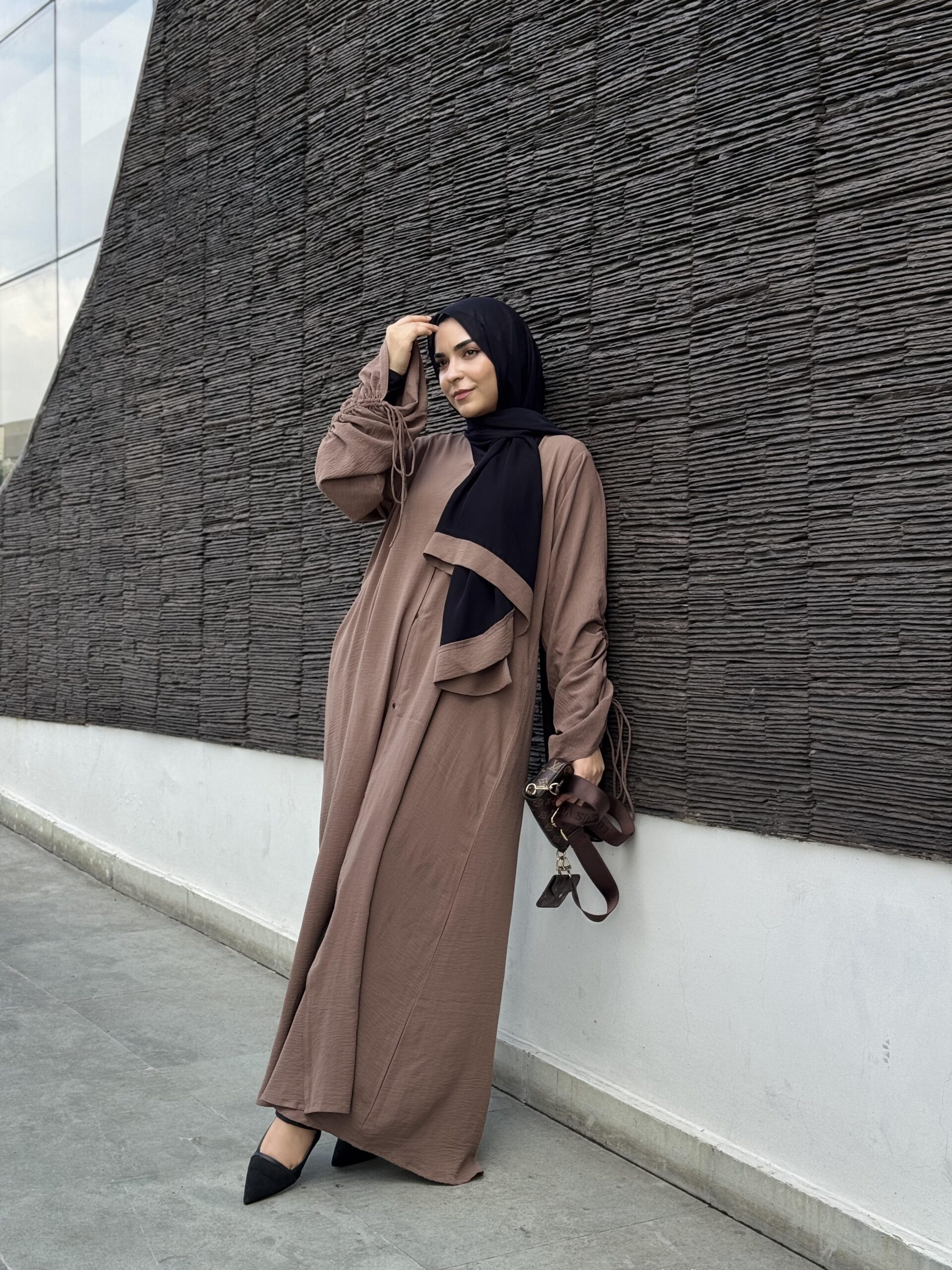 Discover understated luxury with our Sand Ruched Sleeve Abaya from the Amna Collection. Designed in a nude-brown sand shade, this abaya embodies earthy sophistication—perfect for women who believe elegance lies in simplicity.